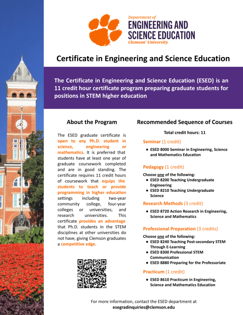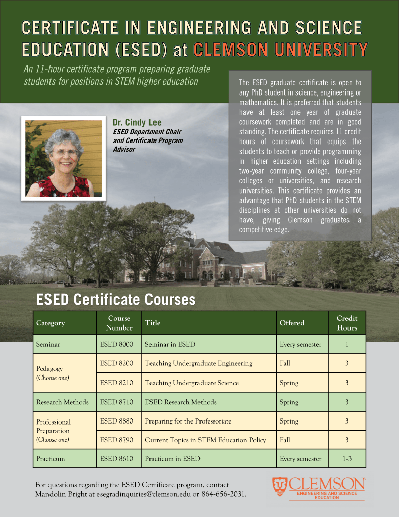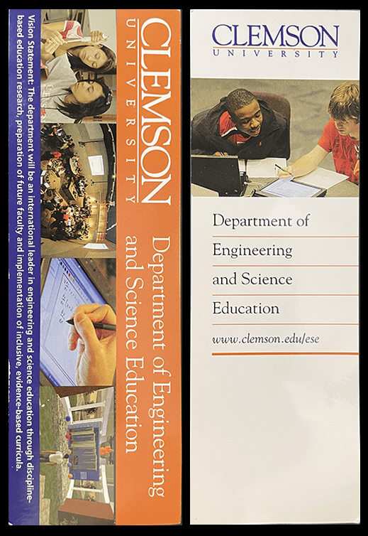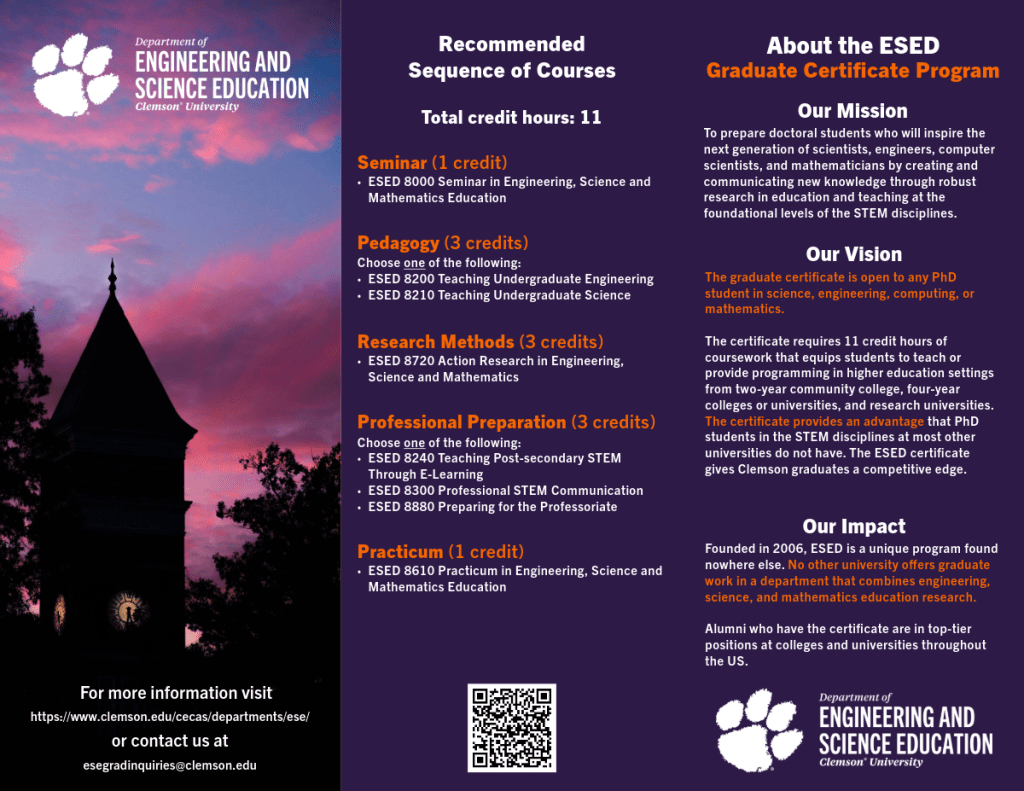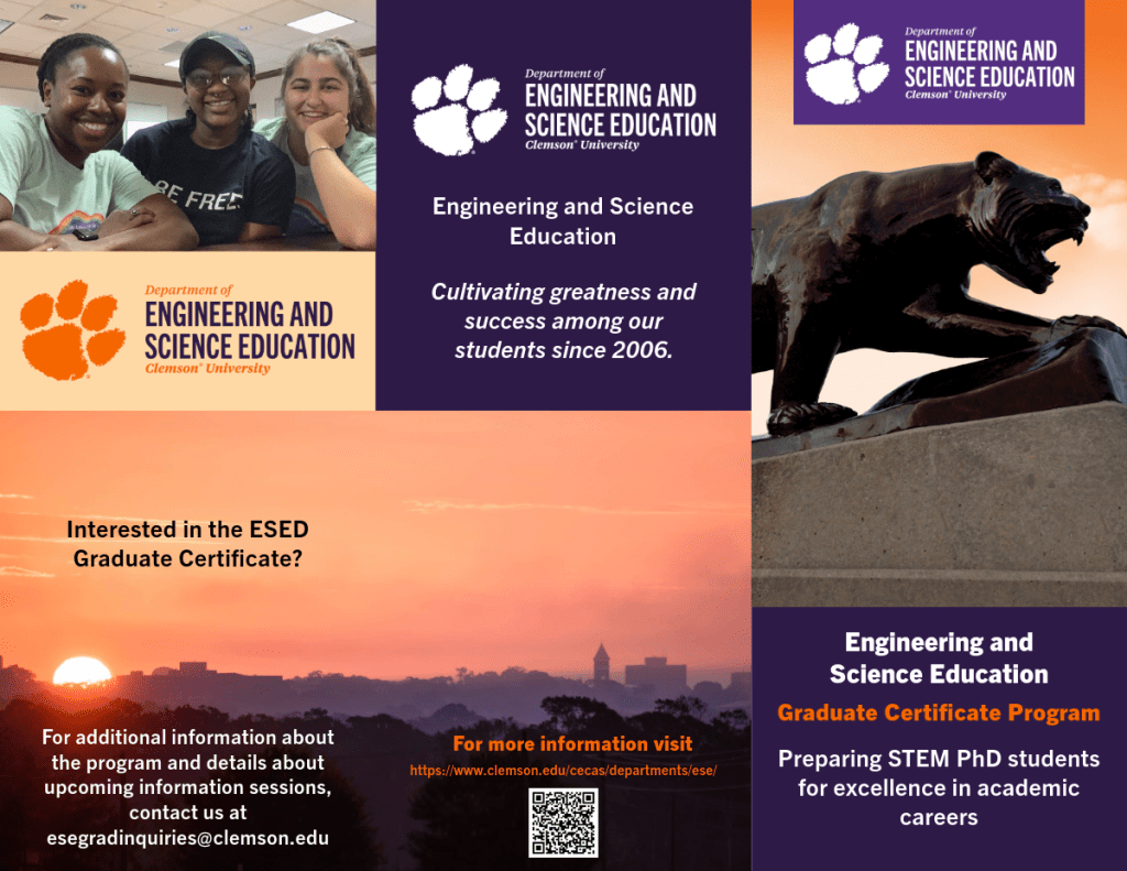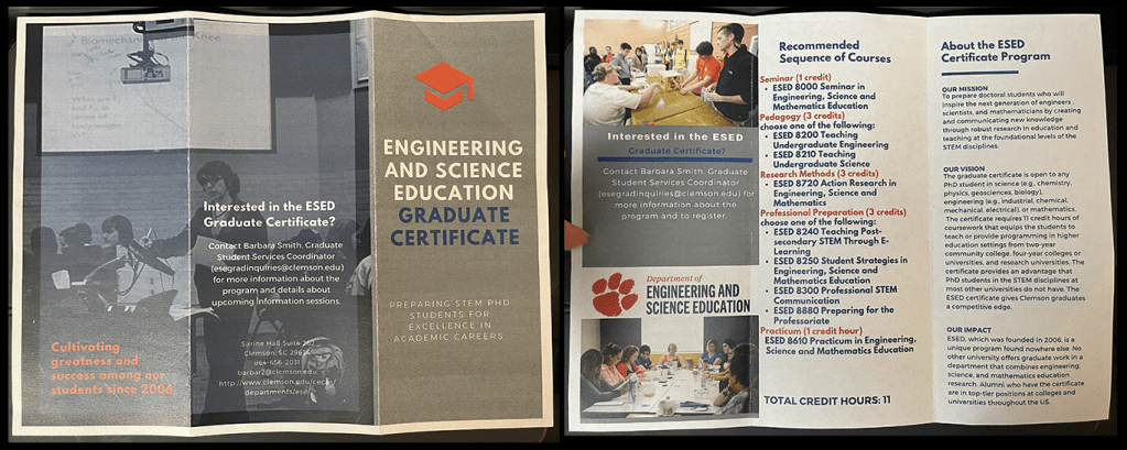Above: The new trifold flyer for the ESED certificate program, outside (left) and inside (right). This was created using Adobe Express (online) and Clemson University images available for promotional use.
